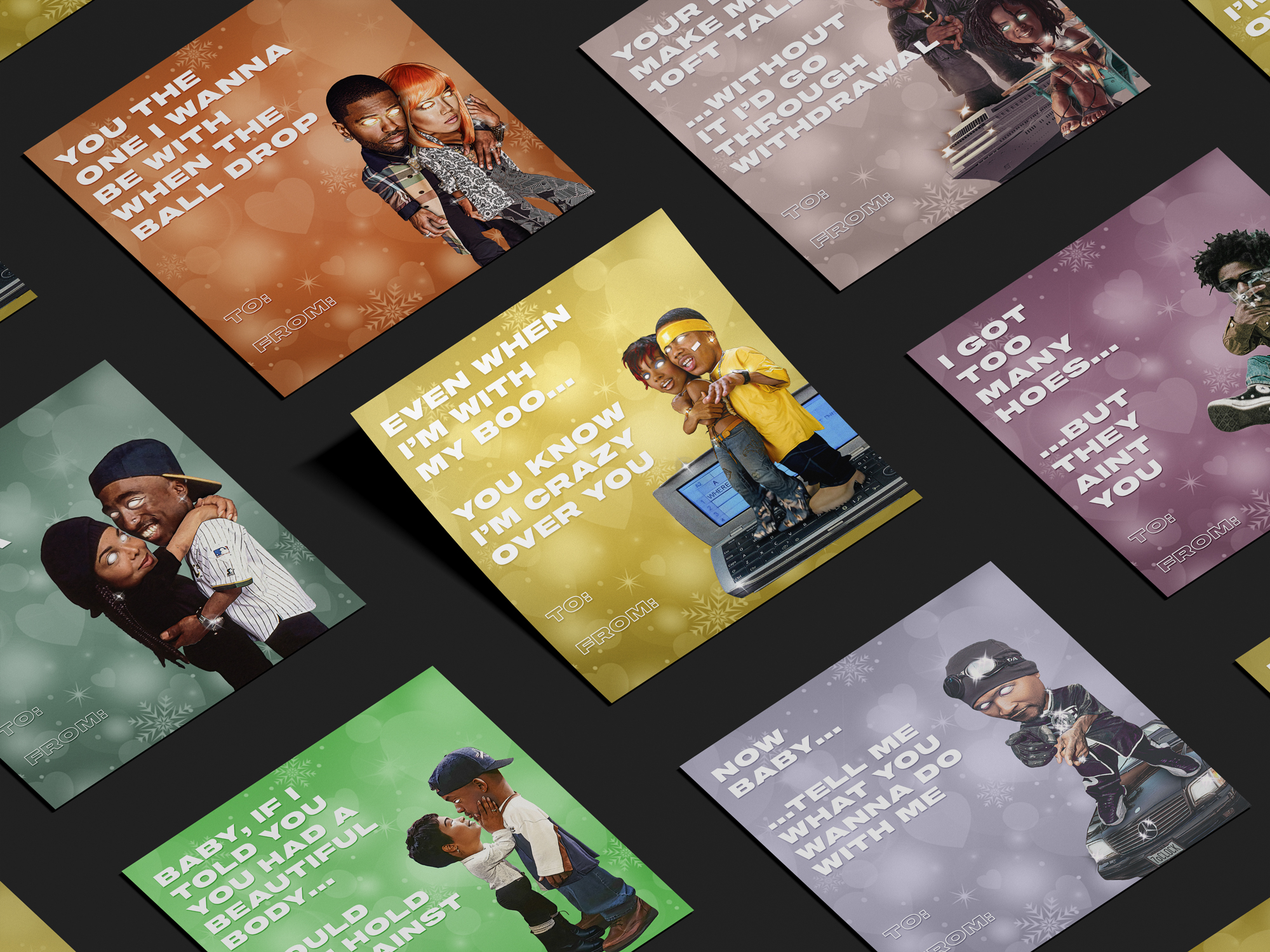 A collection of promotional items in the form of e-Gift Cards to market Cold Creative's Valentine's Day themed 'Lovers and Friends' merch capsule. Featuring designs inspired by Nelly, Tupac, Janet Jackson, Brent Faiyaz, Lauryn Hill, D'Angelo, Usher, Fresh Prince and more.