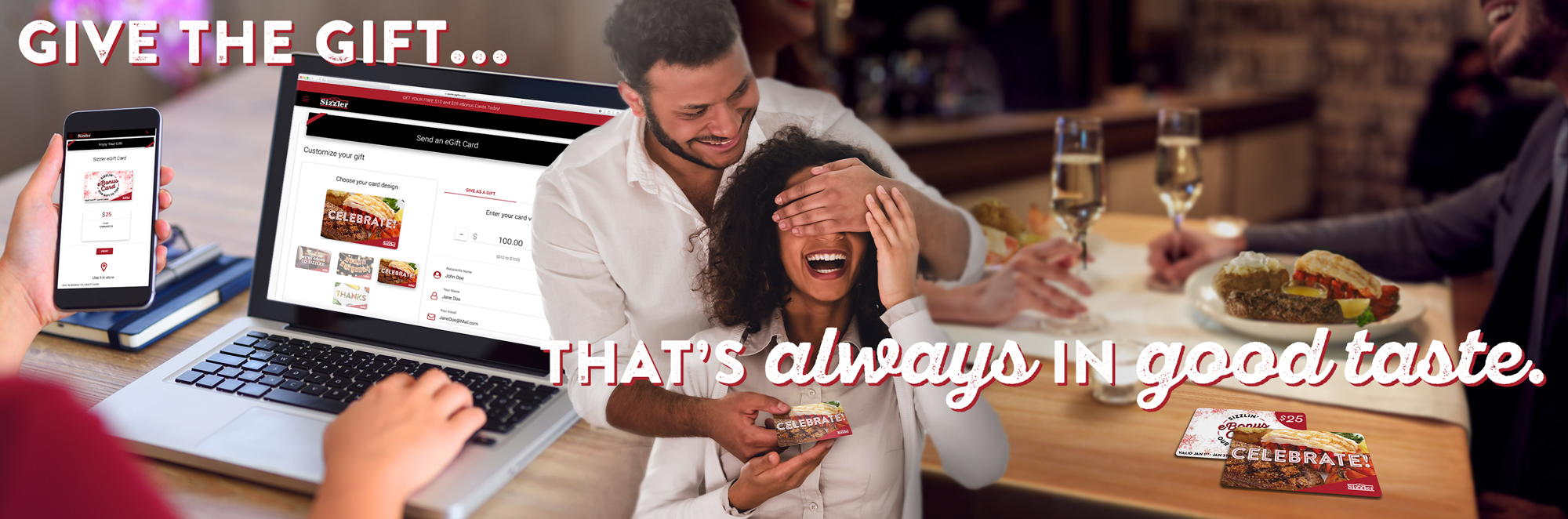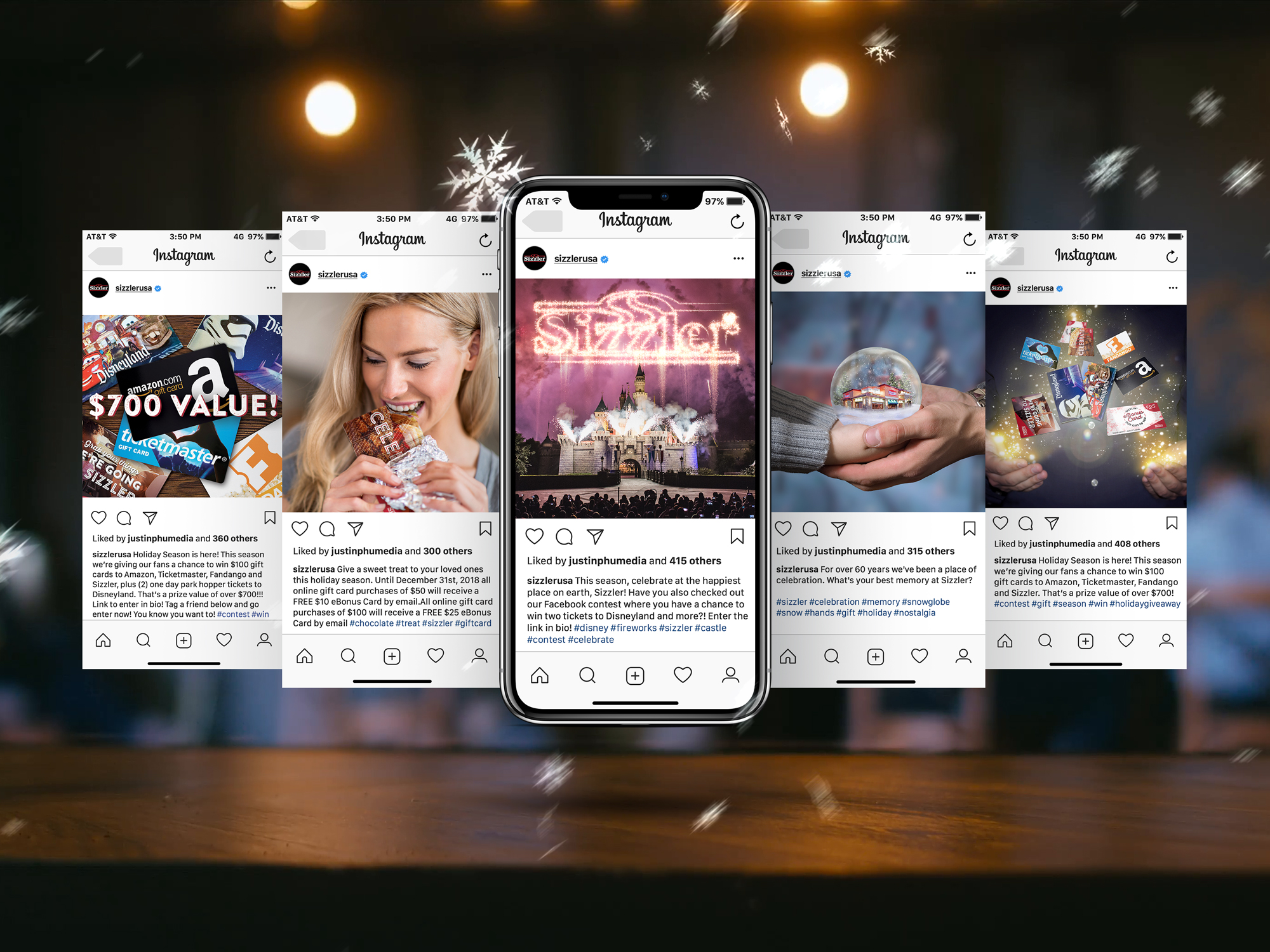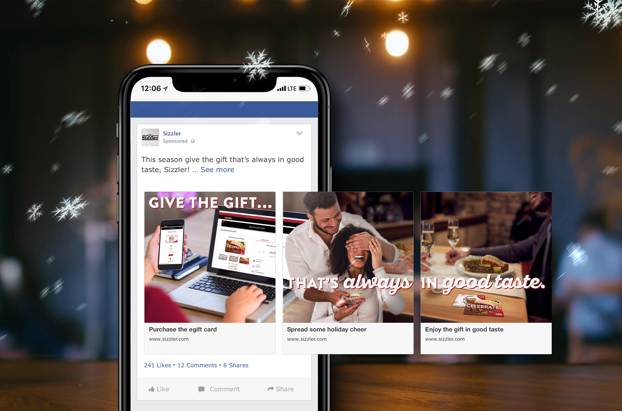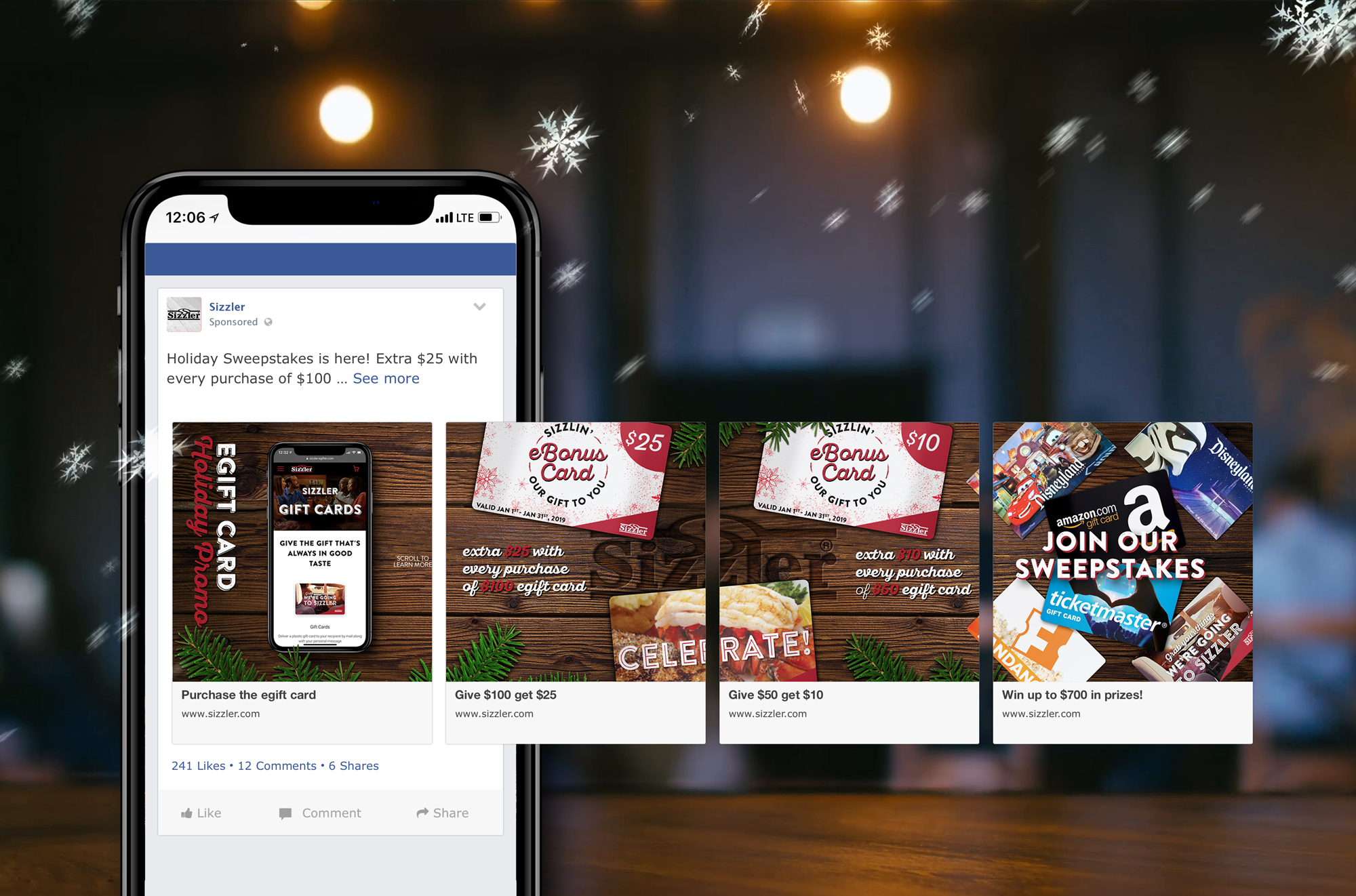 Creative outputs made for Sizzler's 2018 Holiday Sweeps Campaign. The objective for this project was to draw traffic to Sizzler's website, promote egift card sales, and spread awareness for Sizzler's Holiday Sweepstakes. Deliverables include organic social media content, website assets, facebook carousel ads (currently totaling over 150,000 people in reach, over 2,000,000 million impressions and 8,000 clicks to website).